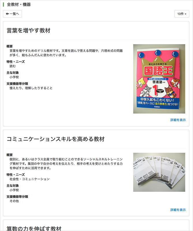 この区分ごとに教材・教具を表示することが可能です。区分をクリックすると、一覧でカテゴリーが表示されます。